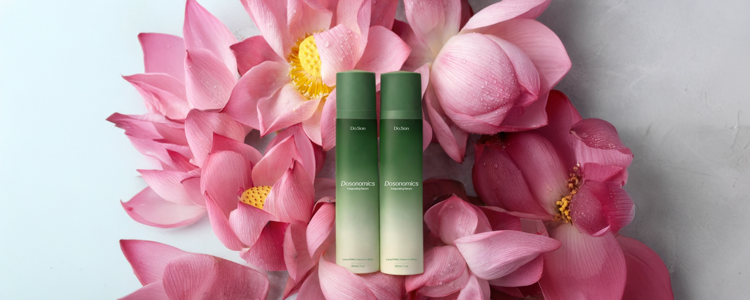 A blooming expression of vitality, where the Dosonomics serum emerges among lotus petals to embody softness, renewal, and luminous skin energy.